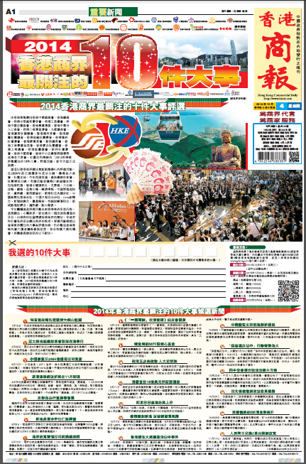 由《香港商報》推薦出20條今年內本港商界關注的重大新聞事件,供商界人士及廣大讀者評選,從中選出得票最多的10件大事,再經「2014香港商界最關注的10件大事」評選委員會評選確認。