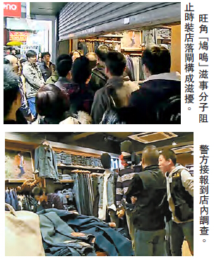網上流傳一條片段,指前晚約11時,一群為數數十人的占領者於一間服裝店外聚集,店員見狀一度想落閘避難,但被人阻止。期間多人聲稱要入店內選購衣服,亦有人出言向店員挑釁,最終須警方介入調停才平息,但事后有人揚言會「日日行入去試褲」。事件起因是該時裝店店員早前曾與聚集人群發生沖突,不排除有人借此報復。服裝店昨日如場業,但據知店員都已暫時調走,由其他分店派員頂替,店內的職員不願多說。
