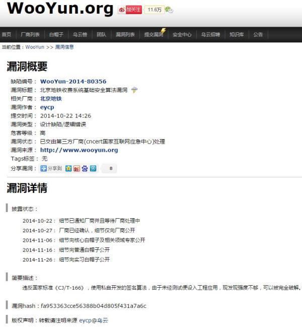 一個多月前,烏雲網曝光稱北京地鐵收費系統存在基礎安全演算法方面的漏洞,已經交給相關部門進行處理,但隨後就沒了下文。日前,有白帽子(不惡意利用漏洞的駭客)進行實測,成功利用充值程式漏洞修改公交卡內餘額。同時希望能引起相關部門重視,儘早修補漏洞。(來源:中國青年網)