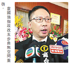 袁國強昨晚出席10大杰青選舉頒獎典禮時,回應有關問題,指距離2017年普選時間緊迫,若要重啟政改五步曲根本無可能完成,在法律及程序上,亦無空間重啟。他說,目前已完成兩步曲,并有人大常委的決定,如不繼續將方案交予立法會,外界可能質疑是政府單方面否決方案。