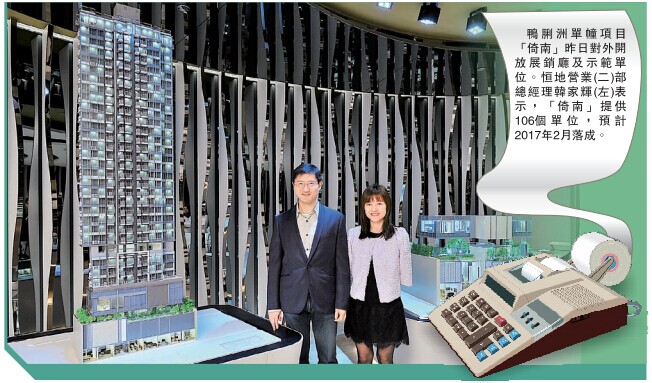 恒地旗下「迎海·星灣御」亦於上周六下午2時推售110個單位,消息指暫錄得32宗成交。同系港島南區鴨昪洲單幢項目「倚南」,於昨日對外開放展銷廳及示範單位。集團營業(二)部總經理韓家輝於記者會表示,「倚南」提供106個單位,預計2017年2月落成。項目已於上周六(6日)晚上載樓書,未來數日將公布價單,料首批單位不多於50個,將涉及所有標準單位戶型,包括1房、2房、3房及3房1套連儲物室間隔。
