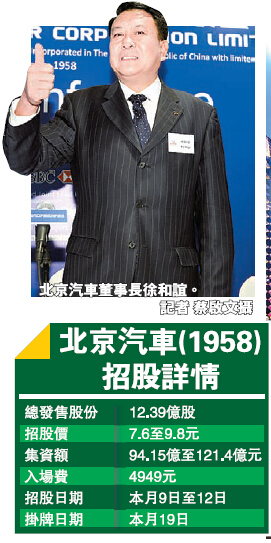 【香港商報訊】記者潘奕祺報道:距離年結不到1個月,巨無霸新股終出場,北京汽車(1958)將於今日起至12日招股,共發售約12.39億股,包括1.13億股舊股,招股價介乎7.6元至9.8元,集資約94.15億至121.4億元;每手500股計,入場費約為4949元。北汽是次引入10名基礎投資者,合共認購近7.86億美元股份。