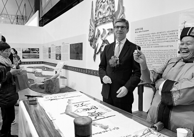 今天上午10點半,BMW中國文化之旅展覽在北京三里屯開展。潘殿噙老人的水書作品是參展內容之一。本次展覽的主題是貴州獨特的民族文化,共展出了包括食、俗、技、藝四個領域在內的一共近40項非物質文化遺產項目。其中,既有人們熟知的茅臺酒釀制技藝、酸湯魚制作,也有侗族大歌、苗族銀飾制作等。