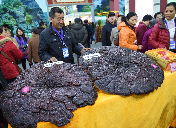 在第七屆廣西名特優農產品交易會現場,參觀者在觀看來自廣西靈川縣的靈芝。