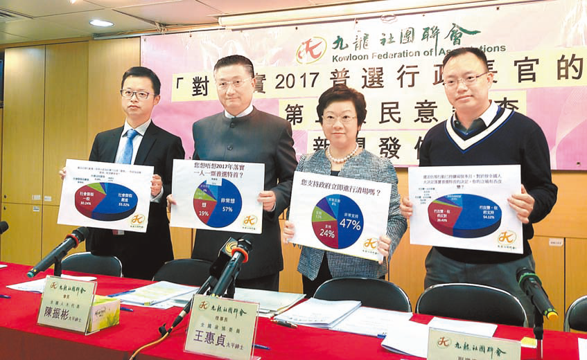九社聯秘書長王惠貞昨日於簡報會表示,該會先後於今年4月及8月進行了兩次「對2017年落實普選行政長官的期望意見調查」,並於本月6日至9日,再次透過電話系統隨機抽樣方法進行第三次調查,成功訪問2864名18歲或以上市民,深入瞭解有關普選問題的意見,並加入有關「占中」及社會撕裂問題。