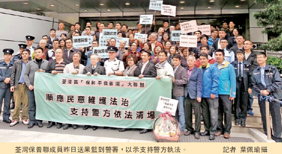荃灣區「保和平保普選」大聯盟約50名成員昨日前往荃景圍荃灣警署送上果籃及祝福,以對警務人員表示肯定及贊同,大聯盟發起人周厚澄表示,連日來的示威行動中,前線警務人員一直受到巨大的壓力,但大部分警員依然保持高度的克制,以專業的手法處理事件,應受到大眾市民的尊重,大聯盟對於警方執法清場非常支持。