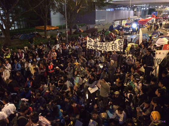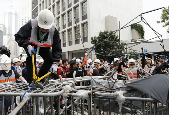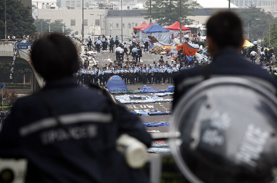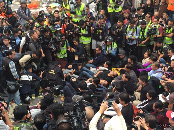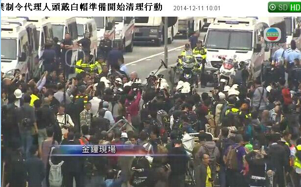 警方早上將在金鐘占領區清場。在添華道與夏愨道交界,多名泛民立法會議員及政黨人士留守,包括民主黨的劉慧卿、何俊仁;工黨的李卓人、公民黨的梁家杰、毛孟靜、社民連的梁國雄,及壹傳集團主席黎智英。