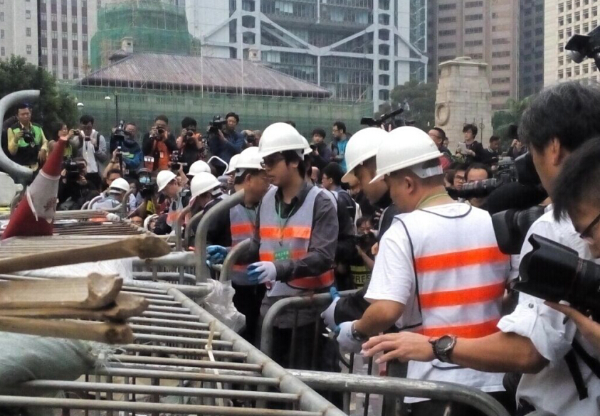 早上10:30左右,多名頭戴白色頭盔、身穿紅色反光背心及手套的禁制令代理人開始移除中環干諾道中、大會堂對開馬路上的鐵欄等大型障礙物,在場有大批傳媒采訪,而警方亦在場戒備,暫時未須介入。