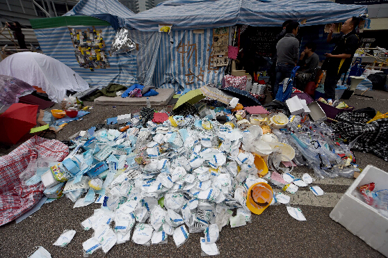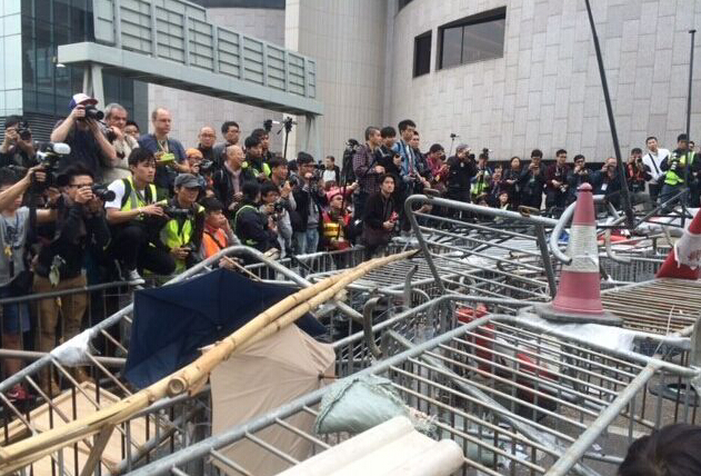 金鐘占領區清場在即,部份占領人士已經收拾物品離開,但現場亦有人將雜物棄置在路上,試圖拖延清場。數名大專學者穿上學袍到場,宣稱要監察警方執行清理行動。