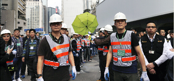 一批執行金鐘臨時禁制令的代理人,已經抵達干諾道中近大會堂,準備清理障礙物。他們戴上白色頭盔、螢光背心、手套及委任證,將分成五組,每組十人,其中一人負責指揮,另一人負責攝影,其馀八人手持細鉗或刀,清理障礙物。 代表律師早前向代理人派發行動指引,要求他們在執行禁制令期間,保持冷靜及微笑、以和平及有秩序方式,拆走障礙物,不要與任何人發生口角或身體接觸。