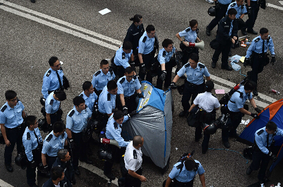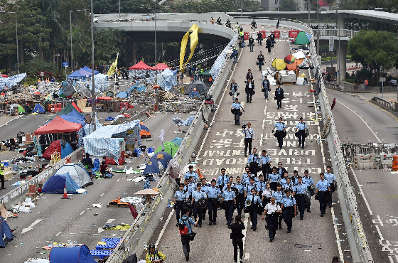 警方動員七千警力,下午兩時許在金鐘占領區,執行清場行動,過程順暢,并并無遇到烈反抗,警員由干諾道中及告士打道,分東西兩路向占領區推進,到下午四時許,開抵夏愨道及添華道交界的核心區,要求在場大批占領人士離開,但不獲理會,占領人士、包括多名泛民立法會議員、學聯及學民思潮成員,手扣手坐在地上,堅持留守,警員將他們拘捕帶返警署。到晚上七時許,占領區仍有數十名占領人士,等待警員帶走,當中包括學聯秘書長周永康。警方表示,截至晚上七時許,在占領區拘捕一百六十人。