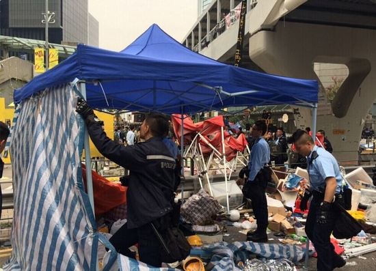警方動員七千警力,下午兩時許在金鐘占領區,執行清場行動,過程順暢,并并無遇到烈反抗,警員由干諾道中及告士打道,分東西兩路向占領區推進,到下午四時許,開抵夏愨道及添華道交界的核心區,要求在場大批占領人士離開,但不獲理會,占領人士、包括多名泛民立法會議員、學聯及學民思潮成員,手扣手坐在地上,堅持留守,警員將他們拘捕帶返警署。到晚上八時許,占領區仍有近二十名占領人士,等待警員帶走,當中包括學聯秘書長周永康。警方表示,截至晚上七時許,在占領區拘捕一百六十人。
