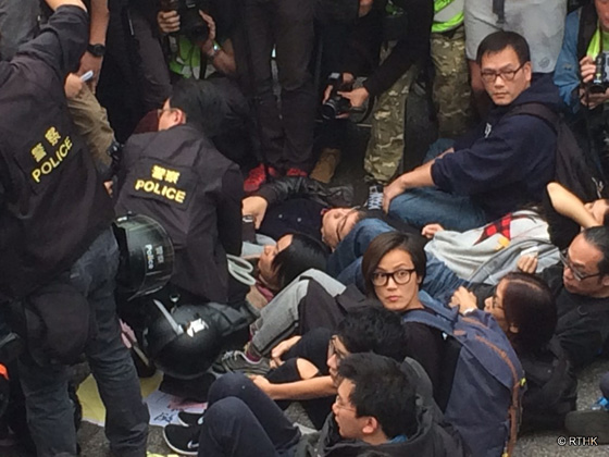 警方繼續在金鐘夏慤道清場,留守人士坐在政總西翼對出的馬路,警方原先逐一拘捕他們,傍晚開始警方改為對一排十多名示威者,採取行動。