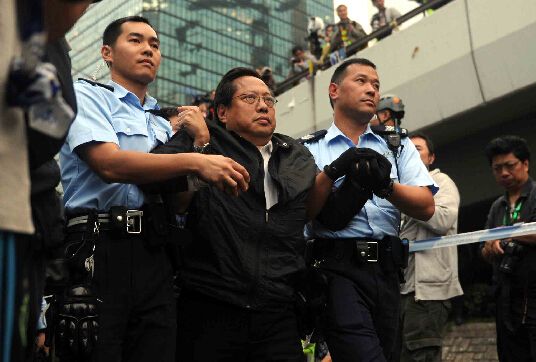 港警依法对金钟非法“占领区”全面清场。图为立法会议员何俊仁被警察带走。中通社