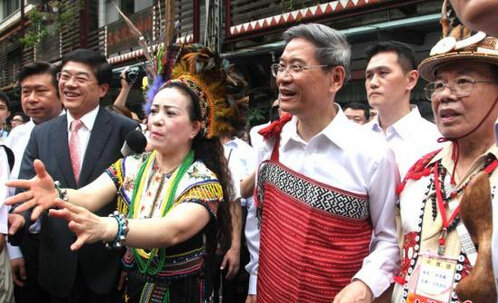 資料圖:2014年6月26日,國台辦主任張志軍(右二)訪台第二天下午來到新北市烏來區,瞭解當地泰雅部落文化。圖為張志軍在當地民眾陪同下觀看傳統舞蹈表演。中新社發陳小願攝
