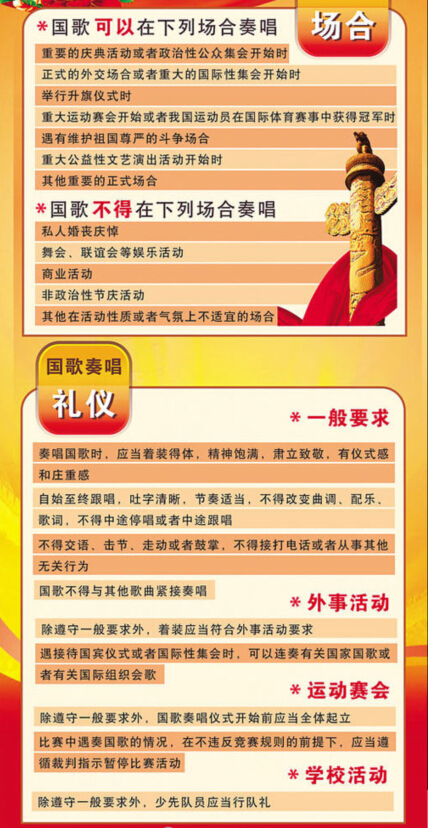 重要的慶典活動或者政治性公眾集會開始時,正式的外交場合或者重大的國際性集會開始時,舉行升旗儀式時,重大運動賽會開始或者我國運動員在國際體育賽事中獲得冠軍時,遇有維護祖國尊嚴的斗爭場合,重大公益性文藝演出活動開始時,其他重要的正式場合。