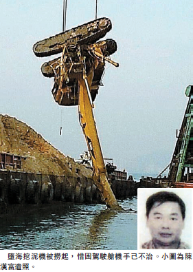 事發1小時後,消防蛙人雖已在海床底發現深陷厚厚海泥中的挖泥機,經多次嘗試均無法將被困駕駛室內的事主救出。至昨日清晨6時許,拯救人員再要求出動吊船到場協助吊起挖泥機救人,及至昨午2時40分,始將事主連人帶機吊回躉船上,惜他早已身亡。早已到場等候消息的兩名兒子,目睹父親死狀,傷心欲絕,情緒一度激動。