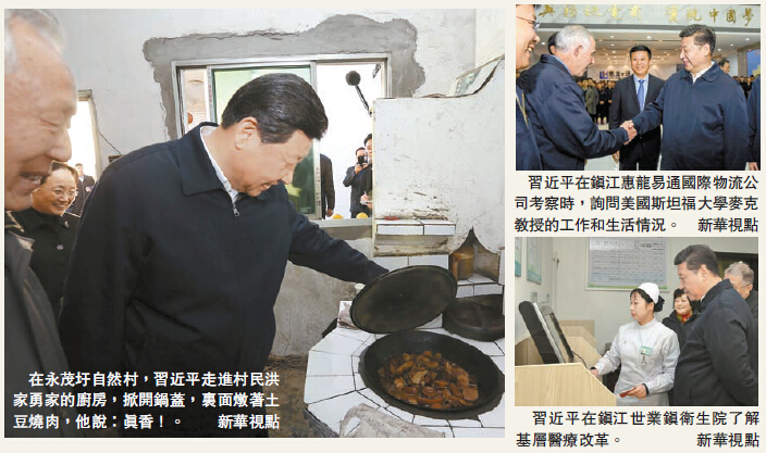 13日下午,習近平首先來到鎮江市丹徒區世業鎮衛生院,了解農村醫療衛生事業發展和村民看病就醫情況。隨后又深入到世業鎮先鋒村農業園調查了解現代農業發展情況。在世業鎮永茂圩自然村,習近平走進村民洪家勇家,進廚房,開冰箱、揭鍋蓋、擰龍頭,同他們一家圍坐在一起,拉家常、談生產、問民需。當天下午,他還來到惠龍易通物流公司考察。