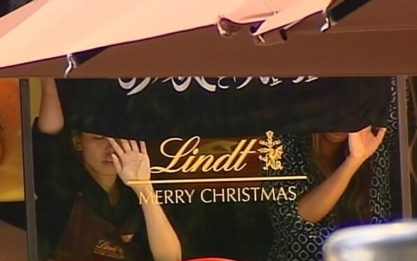 悉尼市中心現在已經遭到了警方的封鎖,Martin Place的咖啡店內被判斷至少有2名槍手,該2名男子強迫店內人質在窗戶邊舉起伊斯蘭旗幟。據稱,有多達13名人質在Lindt Chocolat咖啡店內被挾持。圖為咖啡廳內人員貼著玻璃,舉著黑旗。
