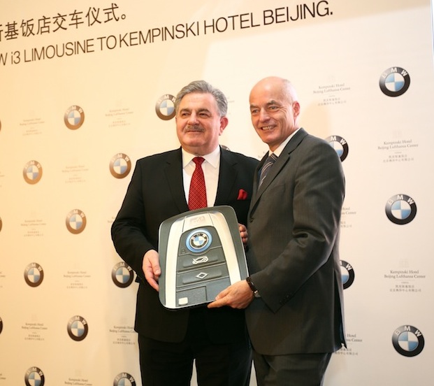 2014年12月11日,北京凯宾斯基饭店与宝马中国共同举办的BMW i3交车仪式在饭店宴会厅隆重举行。宝马中国大中华区总裁兼首席执行官安格先生将车钥匙交到北京凯宾斯基饭店总经理米特维茨先生手中,宣告北京凯宾斯基饭店正式成为中国首家拥有BMW i3电动汽车作为礼宾用车的酒店。
