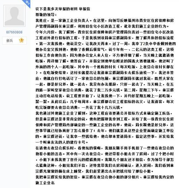 爆料人l87660808隨后在福州吧稱,自己姓莊,是一家施工企業負責人,拍攝不雅照希望能借此舉報晉安區房管局副局長利用舊住宅小區改造工程訛詐他的施工企業的行為,因為之前林宗輝曾向其宣稱在單位吃得開、搞得定,且手中還攥有一、二億元的舊住宅小區改造工程的招標權。