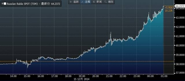 周一,美元兌盧布歷史首次突破60大關,而就在此后幾個小時,受油價再度暴跌影響,這一數字刷新成64,日漲幅突破10%。此前市場認為,美元兌盧布的50關口是盧布“生死線”,而如今盧布一騎絕塵,離這個門檻值越走越遠。