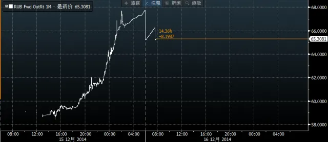 由于盧布貶值幅度過大俄央行連夜召開緊急會議,于莫斯科時間凌晨1點左右意外發布聲明,將關鍵利率從10.5%大幅上調到17%,這是1998年俄羅斯債務違約以來央行最大幅度的加息。俄央行指出,此舉旨在阻止盧布貶值、防控通脹大幅走高風險。加息宣布后盧布1個月互換合約價格出現了3.5%左右的回調,由67.75下挫至65.30一線。