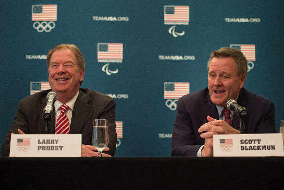 美國奧委會主席普羅布斯特(左)和美國奧委會首席執行官布萊克門在新聞發布會上。