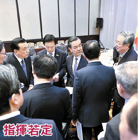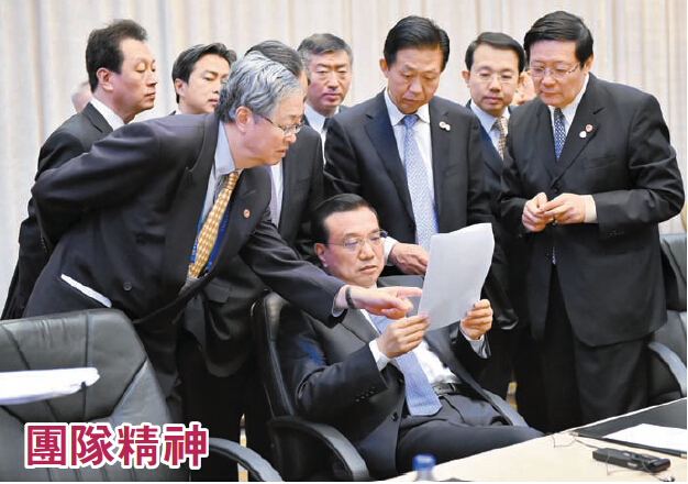 據中新網報道,當李克強總理送走每一位剛剛結束會談的領導人匆匆趕回座位時,隨行的國務院各部部長旋即圍攏到他身旁進行會商。有人注意到,自始至終總理沒顧上喝一口水。一位現場的外交人員感嘆,連上個洗手間的功夫都沒擠出。中新網拍攝的現場圖片顯示,國務院副秘書長肖捷、外交部部長王毅、中國人民銀行行長周小川、財政部部長樓繼偉、交通運輸部部長楊傳堂、外交部副部長王超等人在會見間隙圍攏在李克強身邊,進行商談。幾位部長不時拿出平板電腦,給李克強總理演示。 截至目前,李克強總理今年已訪問了12個國家,算上即將參加的大湄公河次區域經濟合作第五次領導人會議,訪問期間李克強共出席6次多邊國際會議,經常同時會見多國領導人。如果都是這個節奏,大國總理真不是一個「忙」字了得。