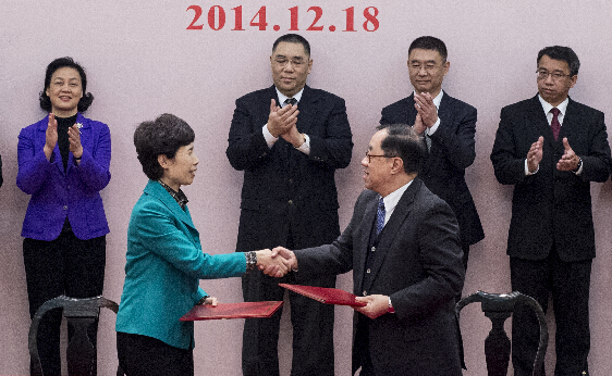 當天下午,商務部副部長高燕和澳門特區政府經濟財政司司長譚伯源分別率領兩地政府代表團,在澳門特區政府總部舉行2014內地與澳門CEPA聯合指導委員會高層會議。會後,在澳門特區行政長官崔世安、中央駐澳聯絡辦公室副主任姚堅、廣東省副省長招玉芳、外交部駐澳門特派員公署副特派員潘云東見證下,高燕和譚伯源代表雙方簽署了協議。