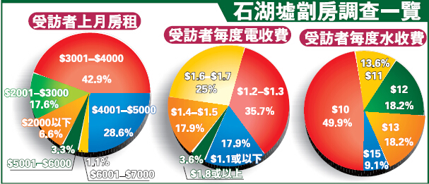 調查又指,有三成受訪者表示,現時所居住的地方曾出現滲水漏水及蟲鼠滋擾,亦有逾兩成半人表示曾遇過石屎剝落,反映區內「劏房」存在樓宇結構安全和衛生問題,值得關注。在受訪家庭中,有逾九成人指房租為主要開支、其次為膳食及水電煤。另外,分別有逾七成受訪家庭表示,不知道業主每度電及水的用量收費,發現有「浻房」住戶遭業主濫收水電費。而在知道電費收費的受訪者中,有逾八成人表示須繳付每度電1.2元或以上、水費方面則所有住戶均表示需繳付每度水費10元或以上。
