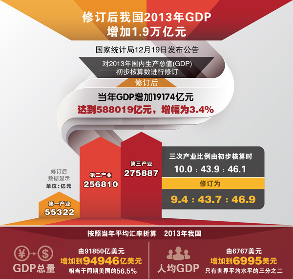 統計局今天公布的報告顯示,依據GDP核算制度和第三次全國經濟普查結果,按慣例對去年全國GDP初步核算數進行了修訂,修訂后的2013年全國GDP總量為588019億元,總量和幅度分別增加19174億元和3.4%。