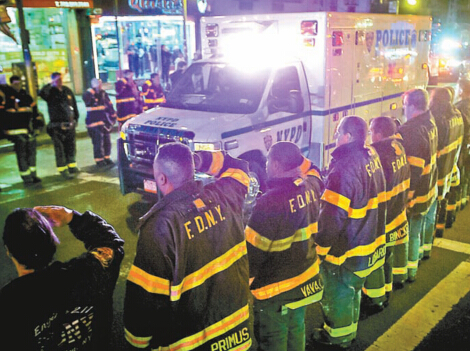 多名紐約警員列隊向在救護車內的遇害警員遺體致敬。