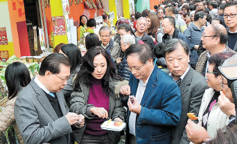 民建聯10多位代表包括主席譚耀宗、黨團召集人葉國謙、副主席李慧琼、立法會議員黃定光及鍾樹根等,昨午到工展會參觀,以示支持本地經濟。一行人在廠商會會長施榮懷「帶團」下,參觀不同類型攤位,包括食品、海味、廚具、售賣精品的社企等;他們對不少產品感興趣,均有在不同攤位試食,沿途不少市民認出一眾立法會議員;他們於場內大概參觀約一個半小時後,不少人都滿載而歸。
