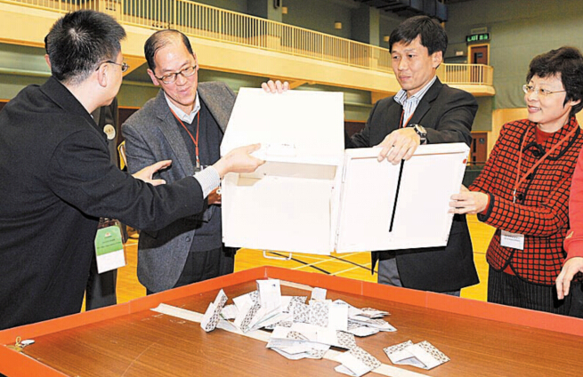 村代表選舉明年1月4日開始連續3個週日進行投票。圖為去屆選舉,民政事務局局長曾德成(左二)在元朗鳳琴街體育館點票站開啟票箱。