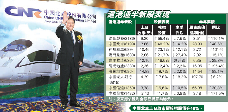 若計及經介紹或配股上市的半新股,共有15隻半新股成為滬港通的港股通標的,涉醫藥、物流、環保、運輸等行業。截至周二,有10隻高於招股價或配股價,但單計本季,錄得上升的僅4隻,包括中國北車(6199)、龍光地產(3380)、光大銀行(6818)及中國信達(1359),以光大銀行升幅較凌厲,明顯受內地A股金融股近周強勢所推動。