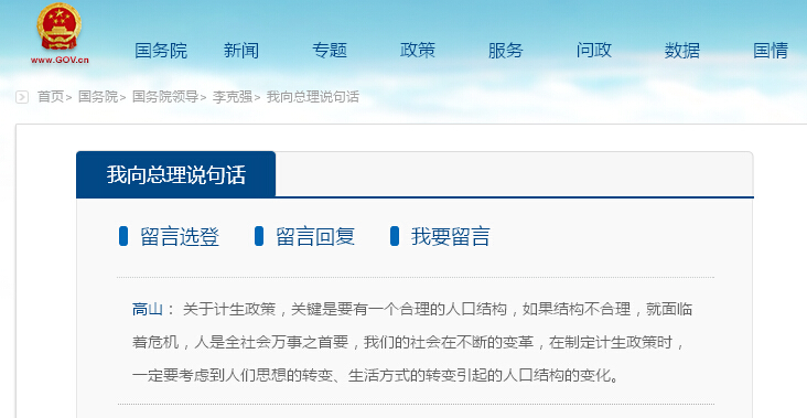 “我向總理說句話”欄目開辦于今年3月份,這是國務院第一個常態化接收網友給總理留言的渠道。