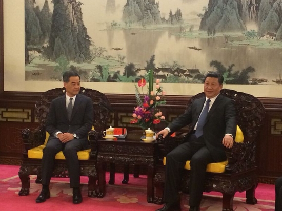 國家主席習近平下午在中海南,會見到北京述職的行政長官梁振英,兩人首先握手,梁振英并介紹隨行官員。習近平指出,一周前兩人才在澳門會面,很高興再次見面,指一年來香港在梁振英帶領下,特區政府全面工作,依法有序推進政改,并努力發展經濟民生,維護法治,保持大局穩定,中央對他的工作充分肯定。