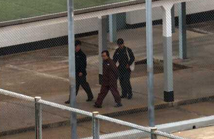 郭炳江身着褐色囚服,被狱警押至指定区域会见子女。