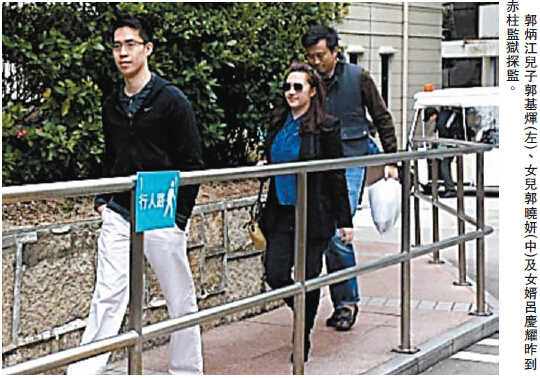 昨午1時許,郭炳江的兒子郭基煇、女兒郭曉妍及其丈夫呂慶耀,抵達赤柱監獄探望郭炳江,期間郭炳江由兩名懲教員押送,低着頭經操場步行到接見室與子女見面,期間有不少囚犯在旁圍觀。郭基煇離開時表示,父親精神還可以,雖然今年第一次不能一家人過聖誕,但父親仍積極人生,提醒及鼓勵指聖誕節的意義是愛與盼望,在這段艱難的時期,上帝自有祝福及安排,他從中得到體會,會堅持信念,更鼓勵他們及公司員工應團結,化悲情為力量,相信「天亮時會有喜悅」,他續指父親相信公司在三叔郭炳聯帶領下,會更上一層樓。