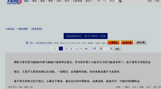 根據微博爆料,網名〝老百姓有自己的樂〞的網友于本月15日晚上8點15分在天涯社會發帖,帖子題目為《馬航被搞垮后,黑手又伸向了亞航》,內文寫到:〝國際大黑手把馬航MH370和馬航MH17劫持和擊落后,作為世界第六大航空公司的馬航基本垮了,處于要死不活的狀態。現在,大黑手又把目標鎖定在亞航,一如既往,必須搞垮亞航,因為亞航也屬于馬來西亞。鑒于黑手的勢力過于強大,心腸過于狠毒,建議出行的中國旅客,遠離亞航,別成為另一個MH370的犧牲品。〞