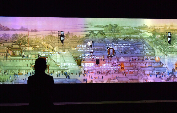 觀眾在觀看利用現代數字虛擬技術還原的圓明園地圖。