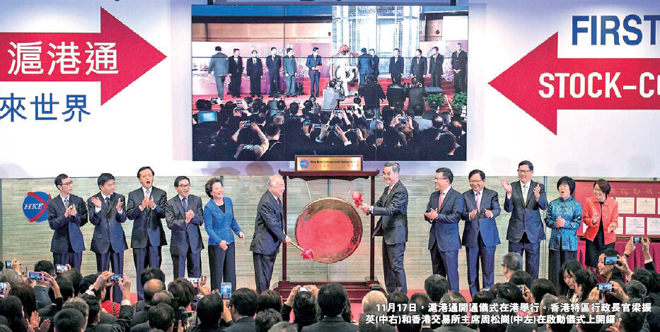 11月17日,滬港通開通儀式在港舉行。香港特區行政長官梁振英(中右)和香港交易所主席周松崗(中左)在啟動儀式上開鑼。
