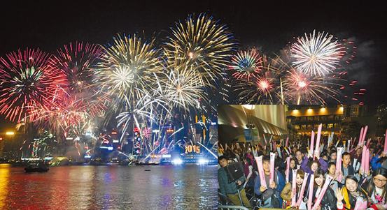 【香港商報訊】記者戴合聲報道:璀璨烟花綻放,送走跌宕舊歲,迎接充滿希望的2015年。昨晚除夕夜,各區都有倒數慶祝活動,縱然天文台發出寒冷天氣警告,仍無減市民迎接新年的熱情。警方估計在多個主要倒數迎新年地區,至少有逾40萬名市民參與倒數活動,其中由行政長官梁振英(CY)主持、旅發局主辦的除夕烟火倒數最熱鬧,8分鐘烟火照亮維港,全城矚目。新落成的中區摩天輪、歐陸嘉年華亦成為倒數熱點,連同每年的倒數熱點蘭桂坊,令中環變成不夜天。尖沙咀麗大道亦首辦倒數活動,反應熱烈;商戶都對新年銷情樂觀。
