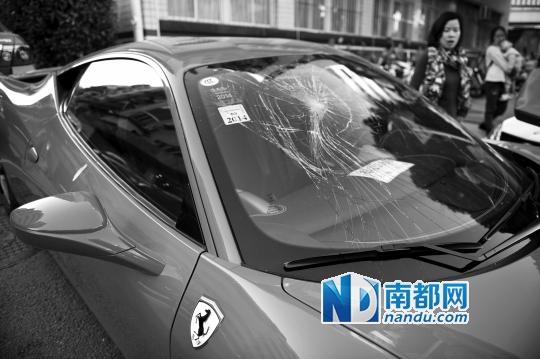 昨日,羅湖區筍崗,一輛被砸的法拉利跑車被拖到筍崗派出所,砸車的幾個男子已被警方控制。南都記者 陳文才 攝
