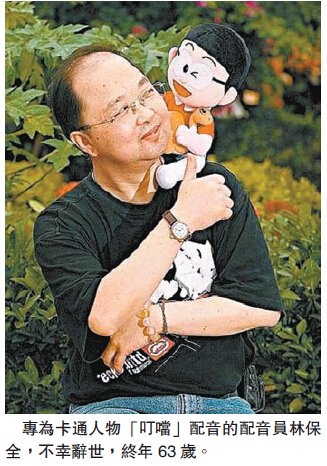【香港商報网訊】記者戴合聲報道:陪伴不少港人成長的卡通人物「叮噹」配音員林保全,昨早在寓所突然猝逝,終年63歲。林保全於70年代加入无线配音組,90年代短暫離開,93年重返无线。30年來,他替舊稱「叮噹」、現稱「多啦A夢」的卡通角色配音,聲線深入民心。无线電視表示,林保全是配音組的資深藝員,他的離世是配音界和无线電視的損失,公司對他離世深感痛惜。