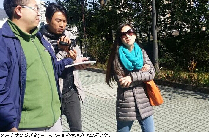今早10時許,林保全的太太及女兒林芷筠,戴上太陽眼鏡,與一名男親友,到沙田富山殮房辦理認屍手續。林太神情哀傷。