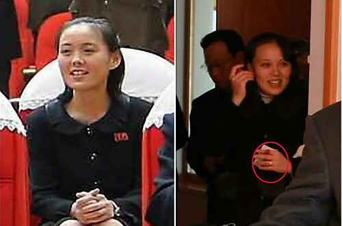 左圖:金與正去年3月與金正恩夫婦一同觀看牡丹峰樂團表演時手上未戴戒指。右圖:1月1日,金與正陪同金正恩看望平壤育兒院和愛育院兒童時,左手無名指上戴著戒指。(韓聯社)