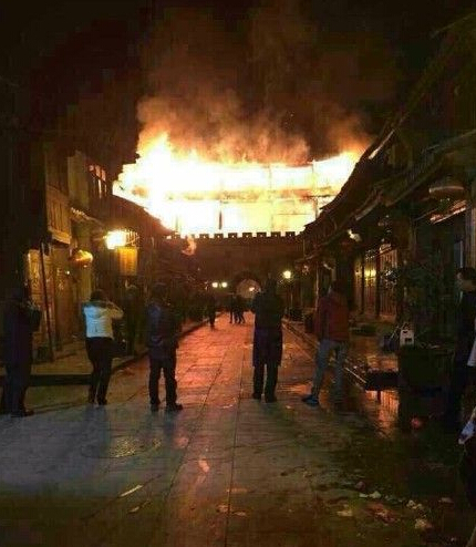 2015年1月3日凌晨三點左右,修建于明朝洪武年間的巍山古城樓起火,雄偉的古樓建筑被毀,目前起火原因不詳。 來源:大理市古城保護管理局