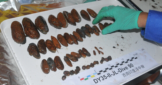 這是“蛟龍”號載人潛水器在海底熱液區采集到的貽貝等生物樣品(1月3日攝)。